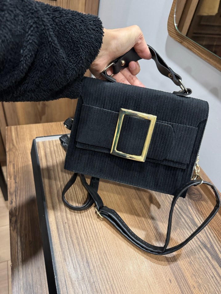 Siyah süet malzemeden yapılmış, tokalı kapaklı ve desenli kadın çanta. Günlük kullanıma uygun, trend sokak stili ile uyumlu.