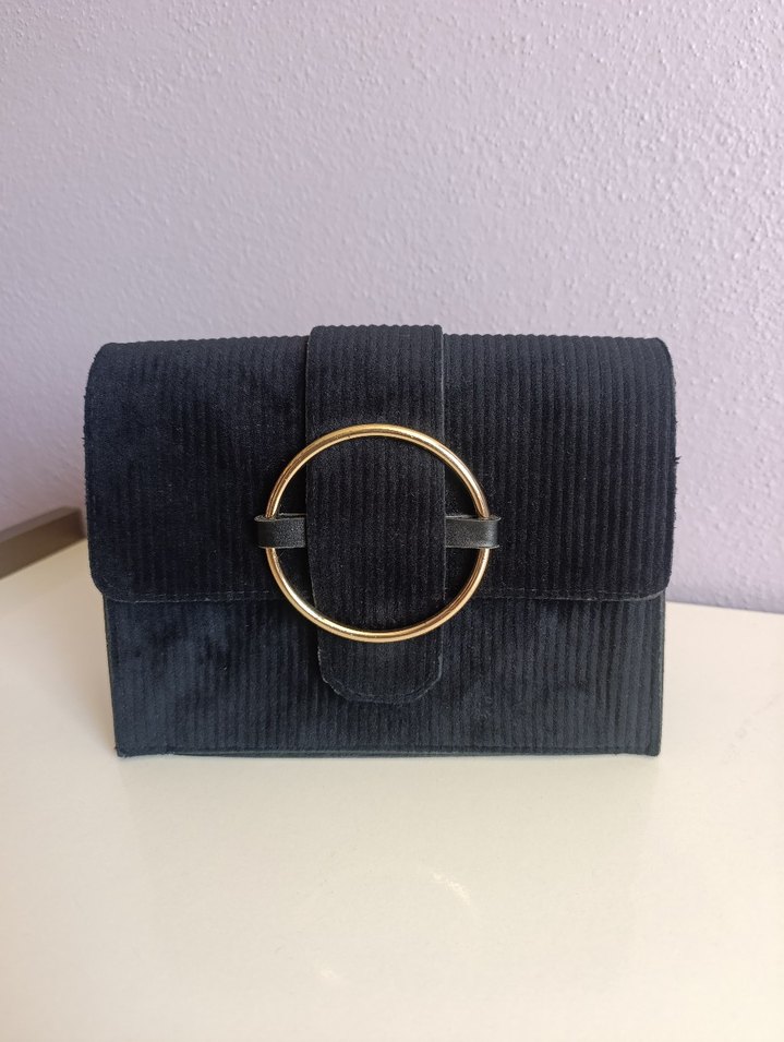 Siyah süet malzemeden yapılmış, tokalı ve baskılı desene sahip modern klasik tarzda kadın çantası, günlük kullanıma uygundur.