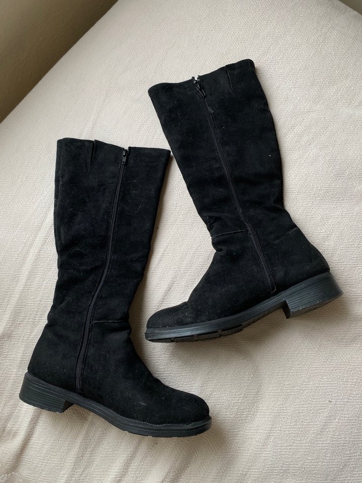 Siyah süet dizüstü botlar, blok topuklu ve tokalı detaylıdır. Desensiz, rahat goth tarzıyla günlük kullanıma uygundur.
