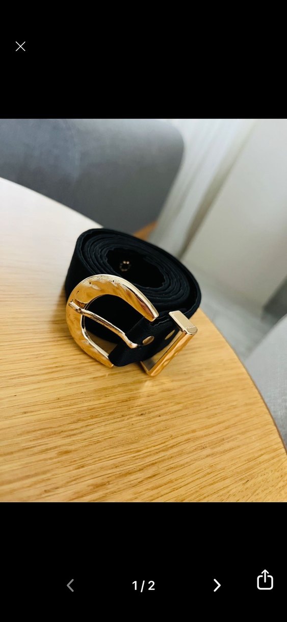 Siyah süet malzemeden yapılmış, tokalı ve altın renkli parlak tokası olan kadın kemeri. Sokak stili için uygundur.
