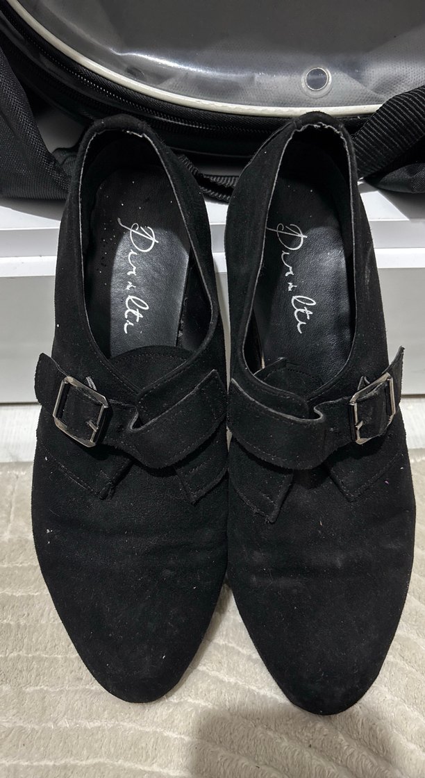 Siyah süet kadın oxford ayakkabılar, tokalı ve topuklu, Paris goth tarzından esinlenmiş şık tasarım.
