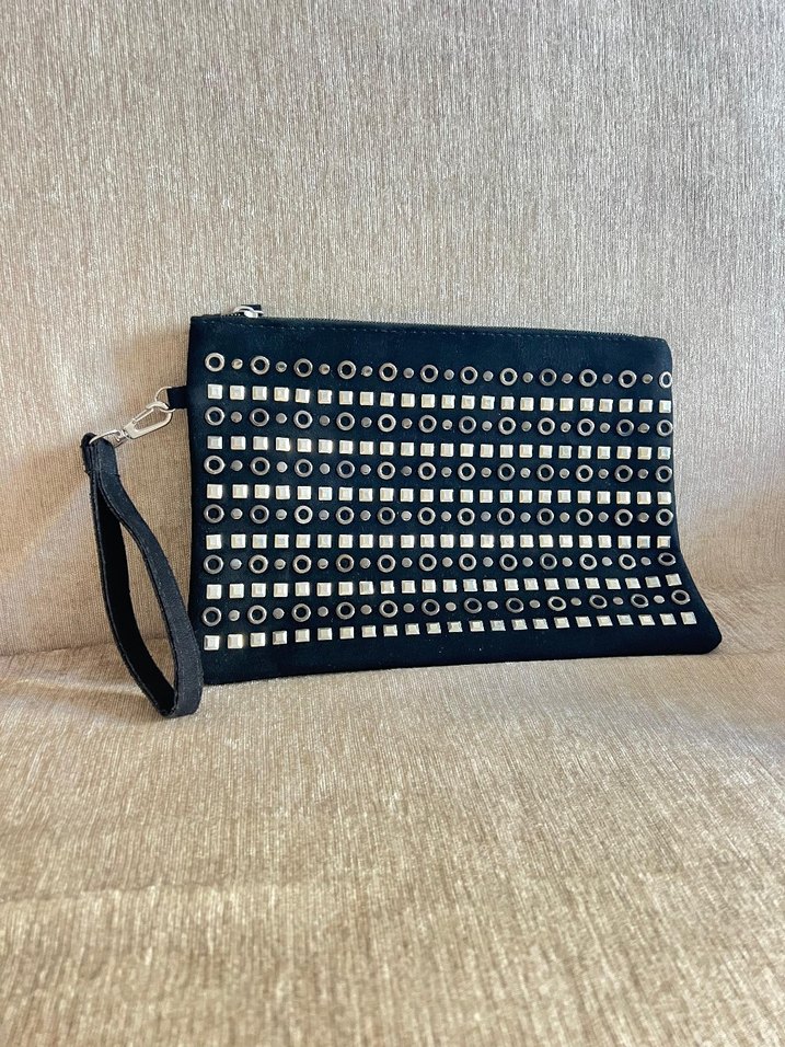 Siyah süet, tokalı ve çeşitli metal aksesuarlarla süslenmiş kadın portföy çanta. Bohem ve çağdaş tarzları bir araya getirir. Günlük kullanıma uygun. sıfır ürün