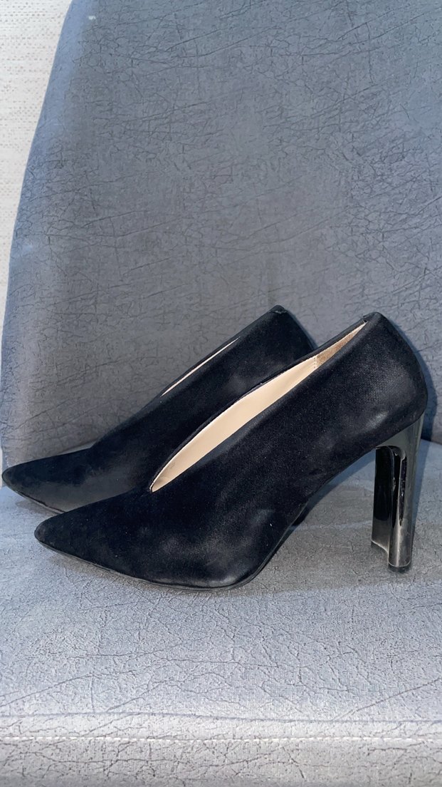 Siyah süet, tokalı kadın stiletto, blok topuklu, ofis için çağdaş iş tarzına uygun.