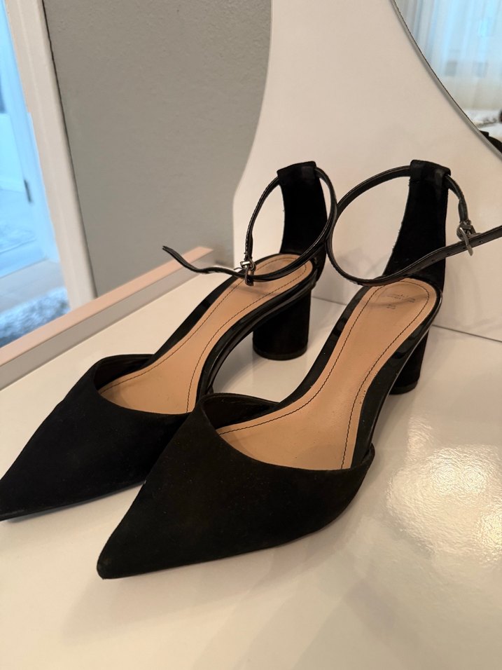 Siyah süet malzemeden yapılmış, tokalı ve blok topuklu, minimalist ve çağdaş stilettolar. Romantik akşamlar için ideal.