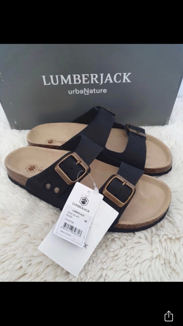 Siyah süet malzemeden yapılmış, tokalı ve kama topuklu kadın terlikler. Minimalist ve gündelik şıklık için uygundur. Lumberjack markalıdır.