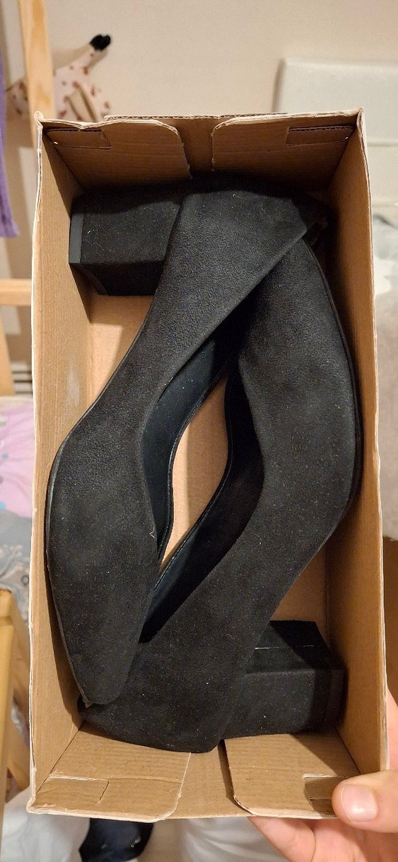 Siyah süet malzemeden, tokalı ve blok topuklu kadın stilettos. Minimalist ve şık tasarımıyla günlük kullanım için uygundur.