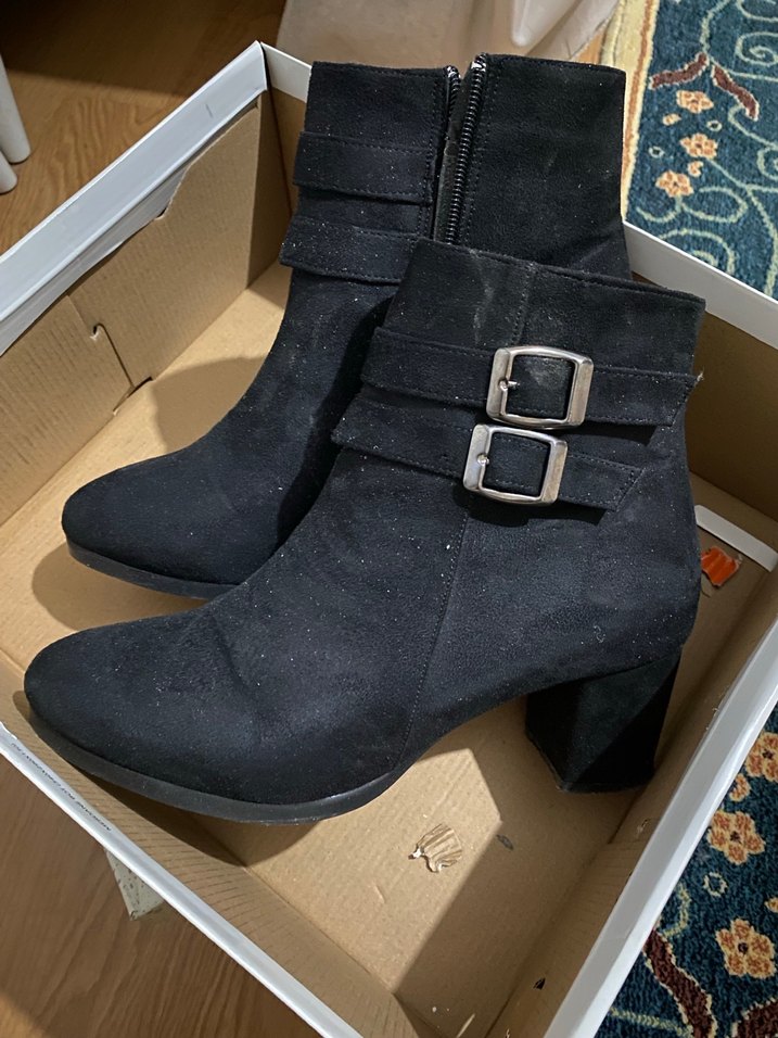 Siyah süet malzemeden yapılmış, tokalı ve kalın topuklu kadın botları. Gotik tarzı ve sokak stiline uygun, günlük kullanıma elverişli. 1 DEFA DIŞARIDA KULLANDILI .