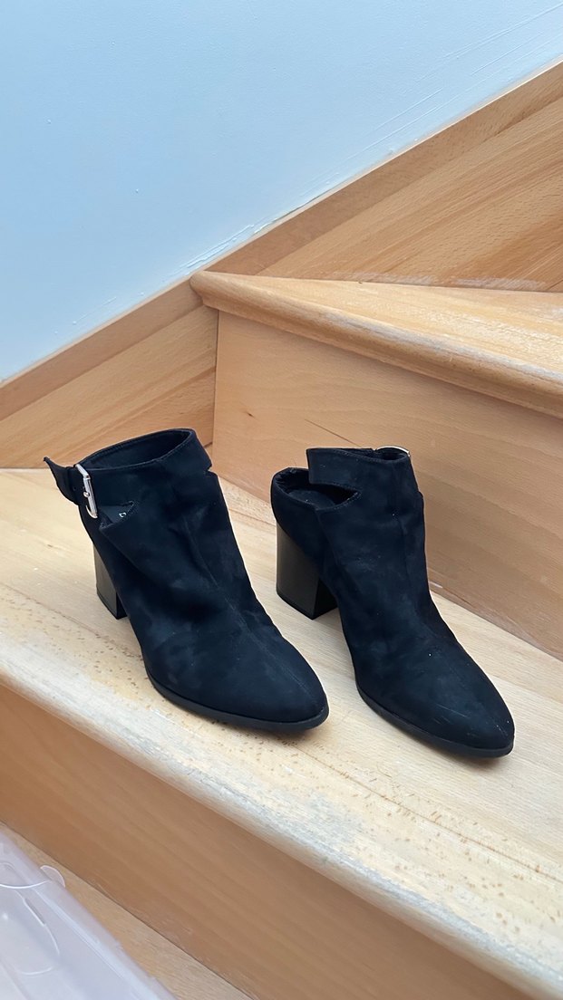 Siyah süet malzemeden, tokalı ve blok topuklu kadın botları. Minimalist ve çağdaş tasarımı, romantik buluşmalar için uygun, desen içermeyen koyu renkte.