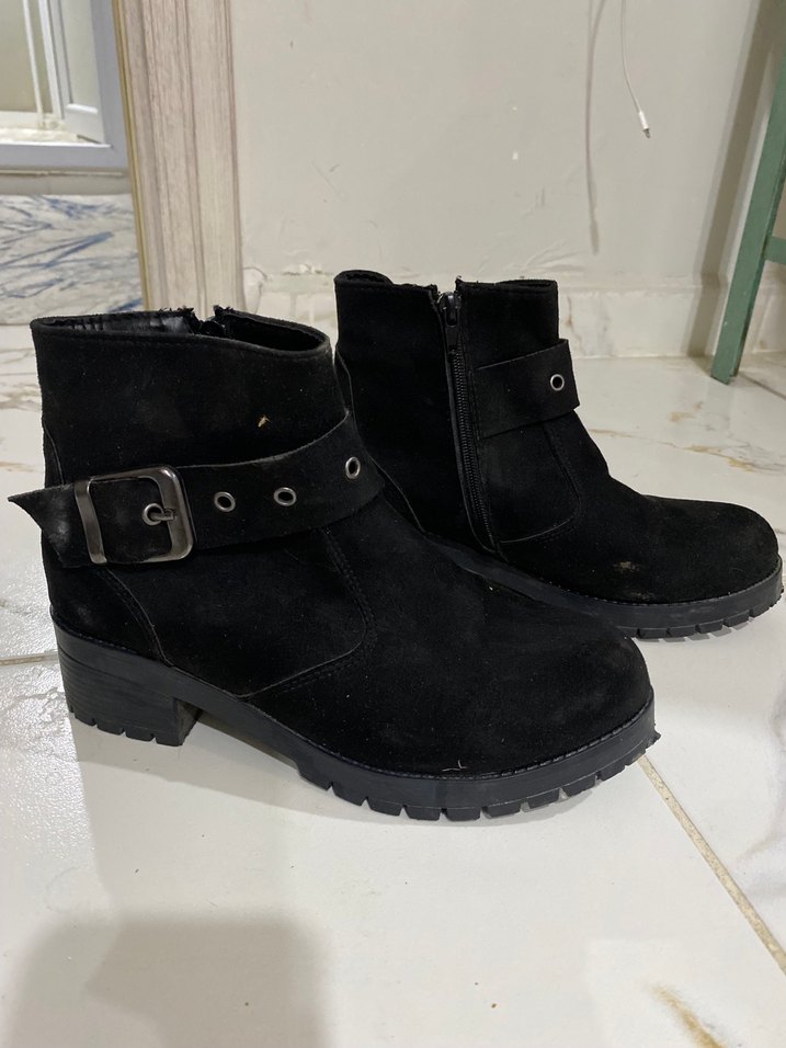 Siyah süet kadın botları, blok topuklu ve tokalı detaylara sahip. Trend sokak stili ve günlük kullanım için uygundur. Desensiz ve koyu renktedir. 2 3 kez anca giyildi ihtiyaç fazlası