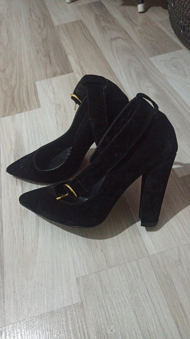 Siyah Süet Tokalı Kalın Topuklu Stiletto