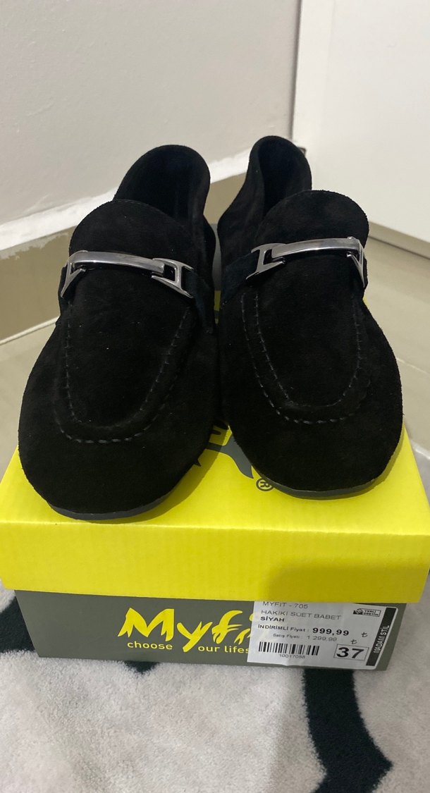 Siyah süet malzemeden yapılmış, loafer ayakkabı. Sokak stiliyle uyumlu, trend bir görünüm sağlar. Numara 37.