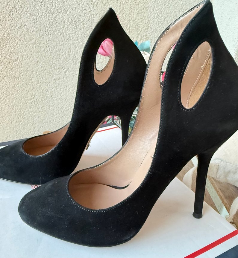 Siyah süet malzemeden yapılmış, tokalı ve desenli, kesik detaylı stiletto topuklu ayakkabılar. Romantik akşamlar için uygun.
