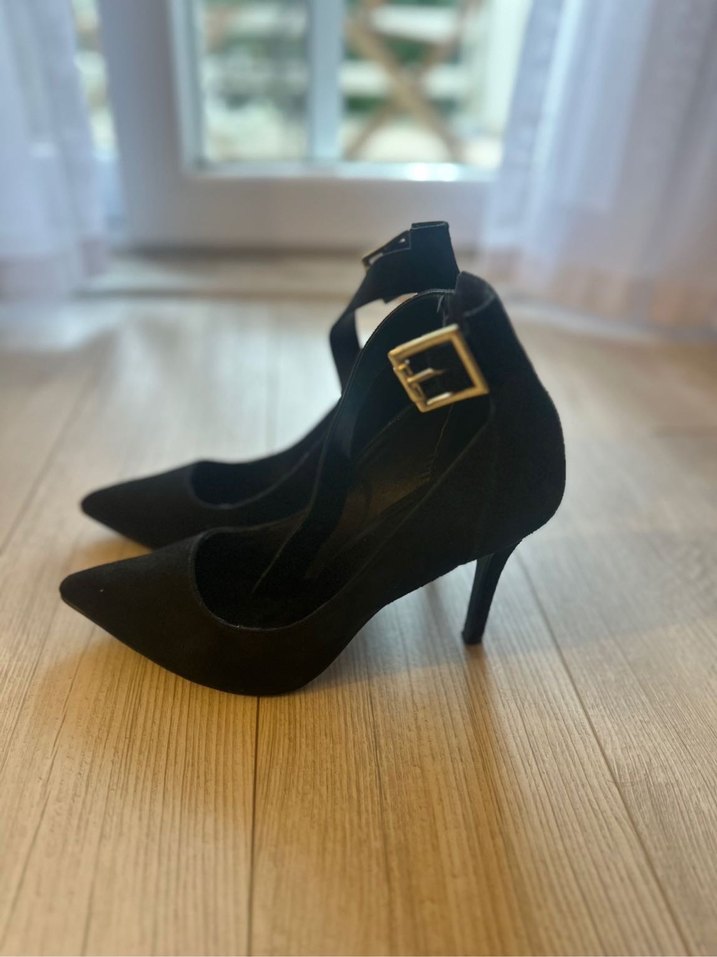 Siyah süet, sivri burunlu ve tokalı bilek kayışlı stiletto topuklu ayakkabılar. Romantik akşamlar için cesur bir seçim.