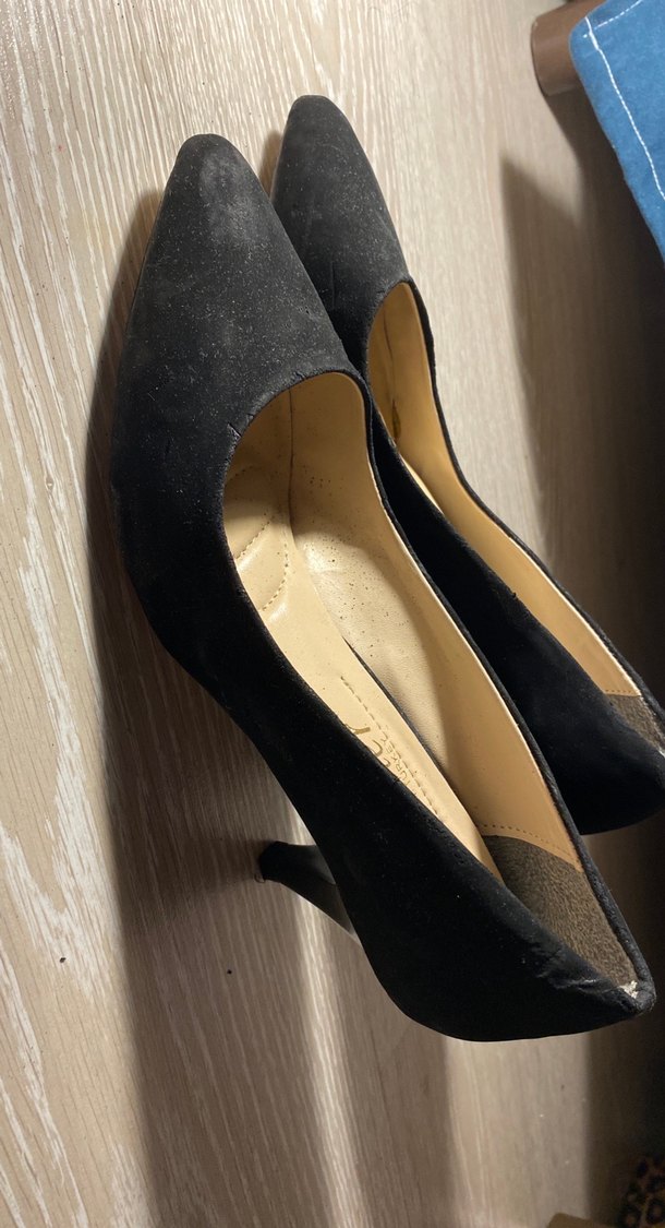 Siyah süet malzemeden yapılmış, tokalı ve sivri burunlu stiletto topuklu ayakkabı, modern ve klasik şıklık sunar. Bir kaç yerinde deforme var