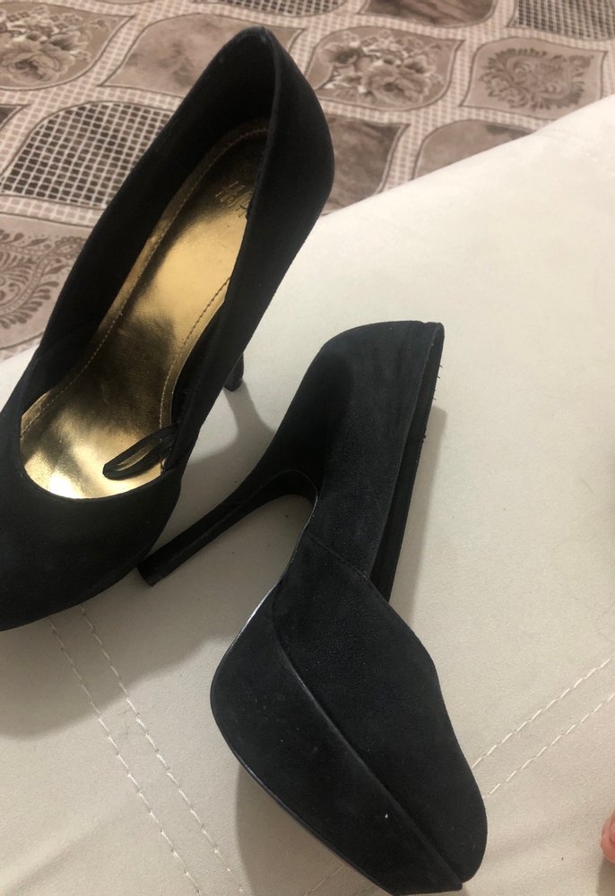 Siyah süet malzemeden yapılmış, tokalı ve stiletto topuklu kadın ayakkabısı. Modern klasik tarzıyla ofis kullanımı için uygundur. Unpatterned ve koyu renklidir.