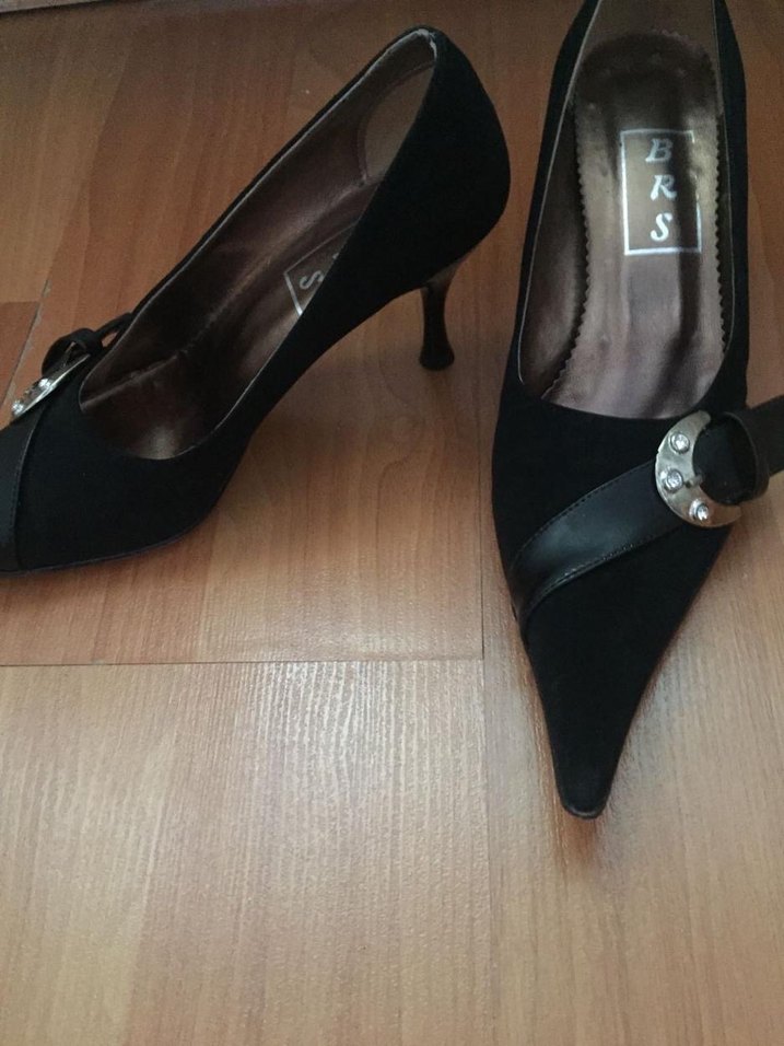 Siyah süet malzemeden yapılmış, tokalı stiletto topuklu kadın ayakkabısı, romantik akşamlar için ideal. Düğün için alınmıştı bir kez düğünde giyildi topuk boyu kısa topuk.