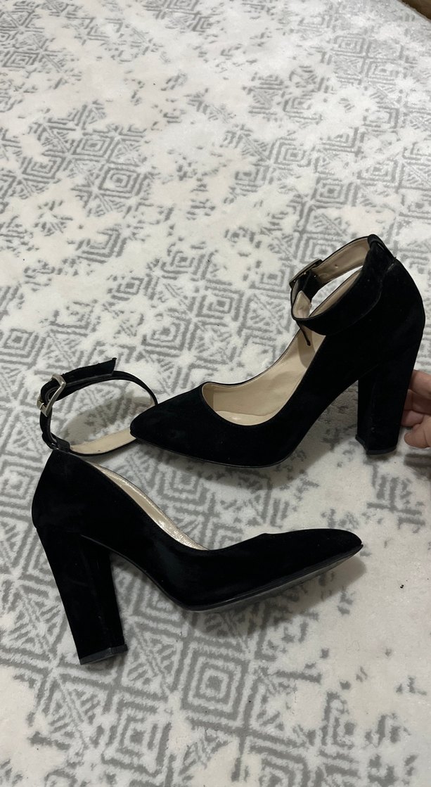 Üründe herhangi bir kusur yok, kullanıma bağlı hafif yıpranmalar var marka temsilidir. Siyah süet, tokalı bilek bantlı ve kalın topuklu kadın stiletto.