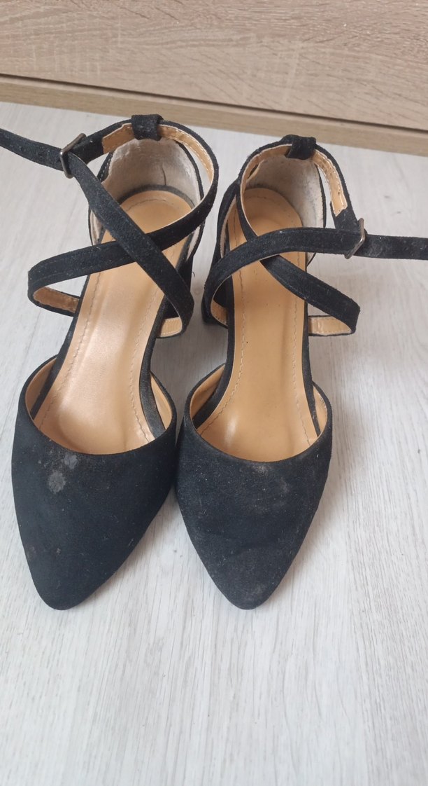 Siyah süet malzemeden, tokalı kayışlara ve kalın topuklara sahip, minimalist gotik tarzda kadın ayakkabısı.