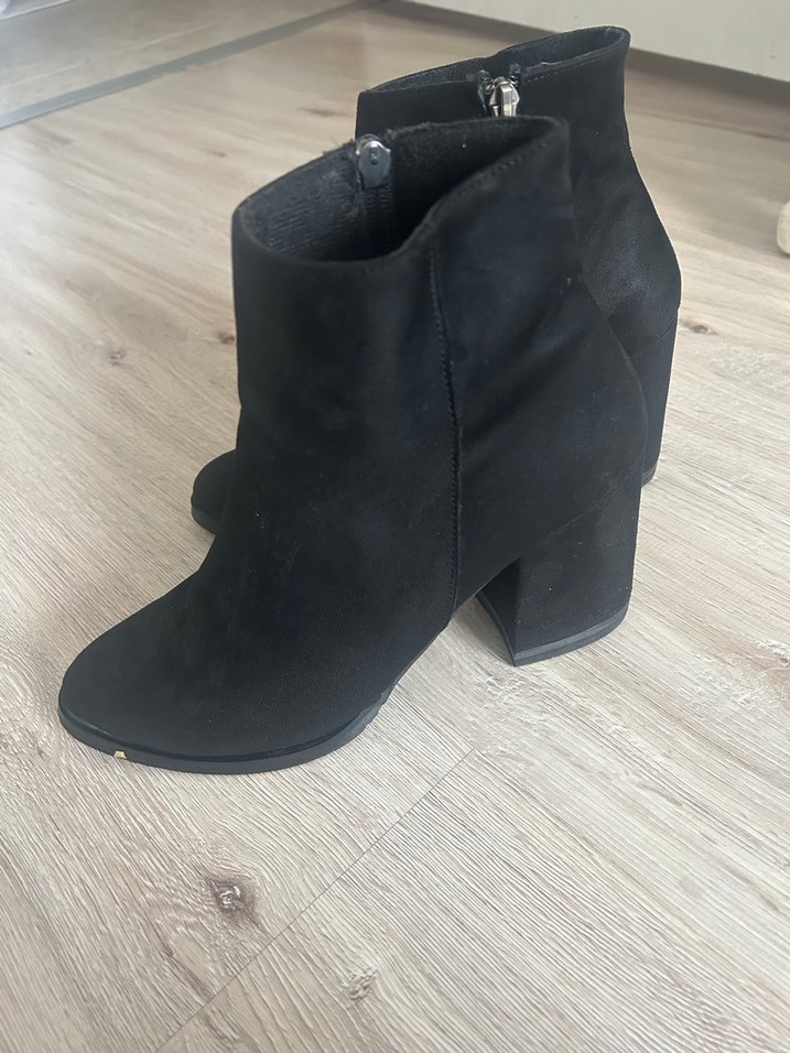 Siyah süet bot, kalın topuk ve tokalı detaylarla günlük kullanım için minimalist gotik tarzda tasarlanmıştır.