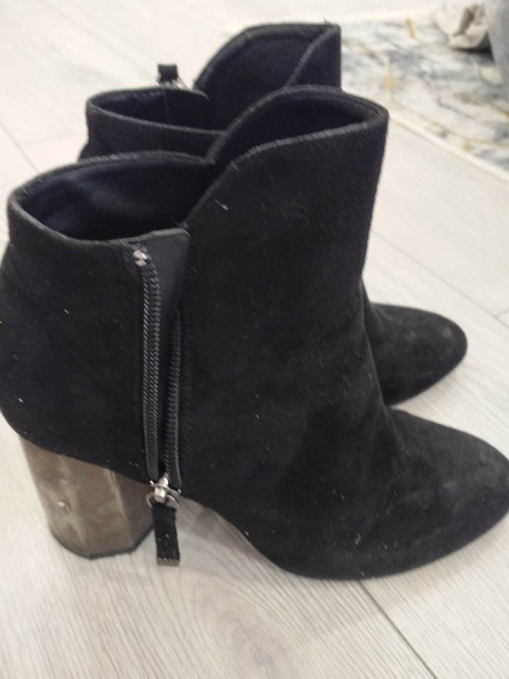 Siyah süet kadın botlar, kalın topuklu ve yan fermuarlı. Tokalı detaylar bulunur. Günlük kullanıma uygun, trend goth tarzda.
