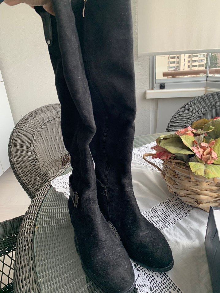 Siyah süet malzemeden uzun, tokalı ve kısa topuklu kadın çizme, gündelik şıklık için uygun. Deri kısımlarında deformeleri mevcut. Dikkatli bakarak alım yapınız!