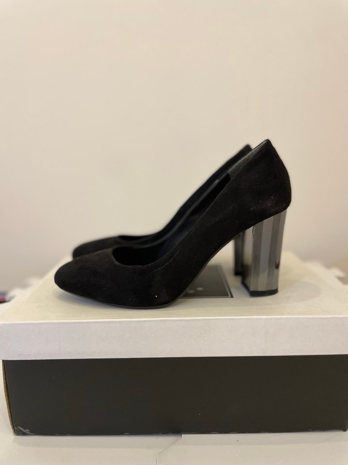 Siyah süet kadın stiletto, blok topuklu. Ofis için uygun, çağdaş Paris tarzını yansıtır.