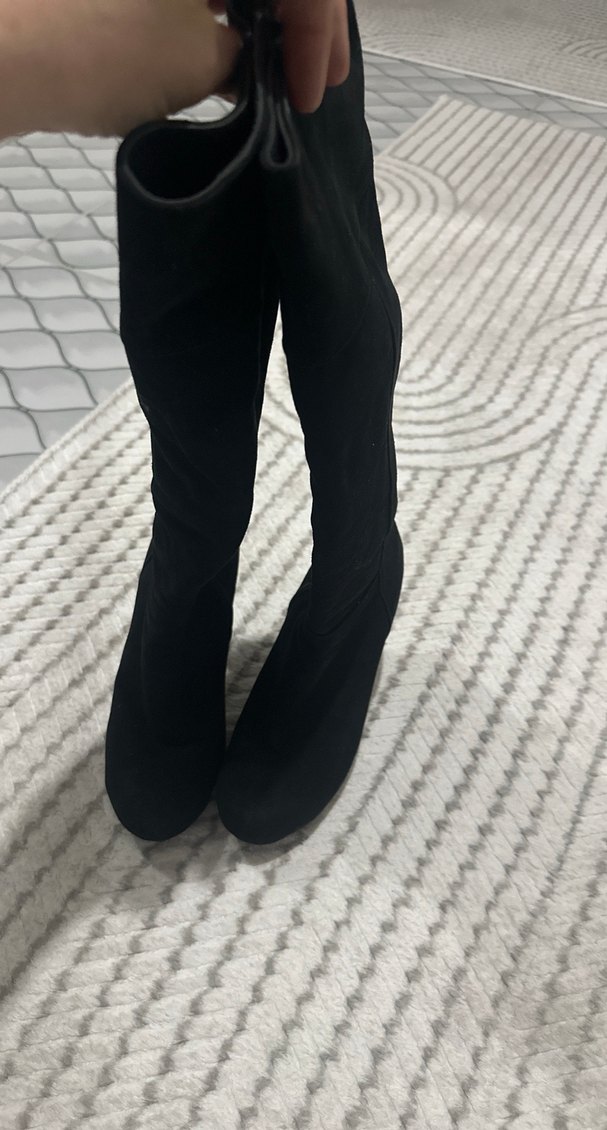 Siyah süet dizüstü çizme, stiletto topuklu ve kürk detaylı, goth tarzı ve rahatlığı bir arada sunar.
