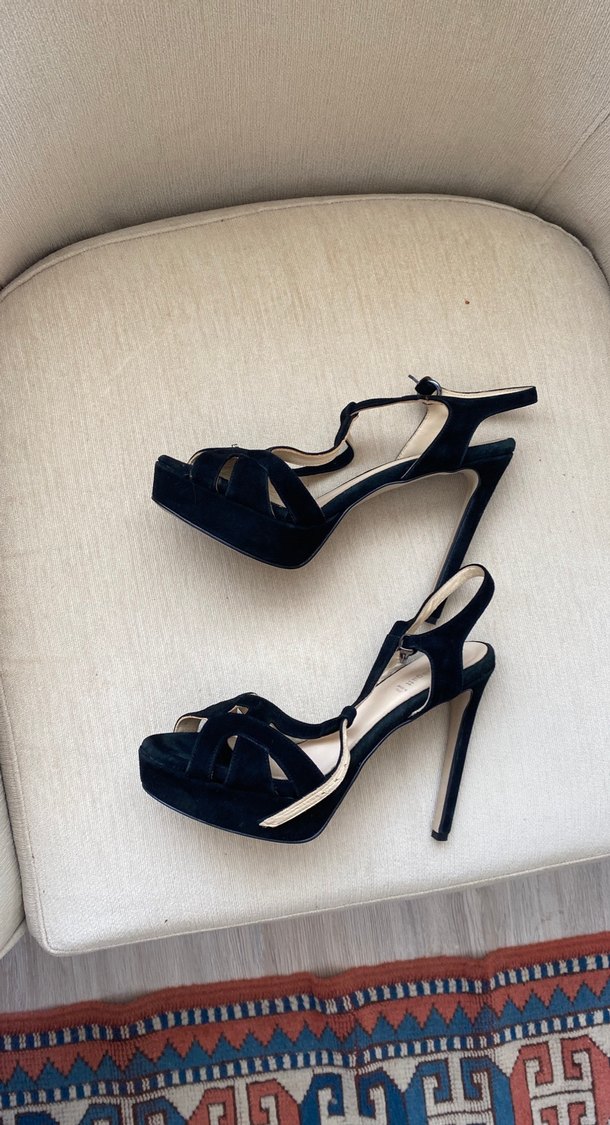 Siyah süet malzemeden yapılmış, tokalı kayışlı ve stiletto topuklu kadın abiye ayakkabı. Minimalist ve çağdaş tasarımıyla klasik şıklık sunar. İtalya dan alındı , ayakkabı bana çok yüksek geldi Bugatt marka