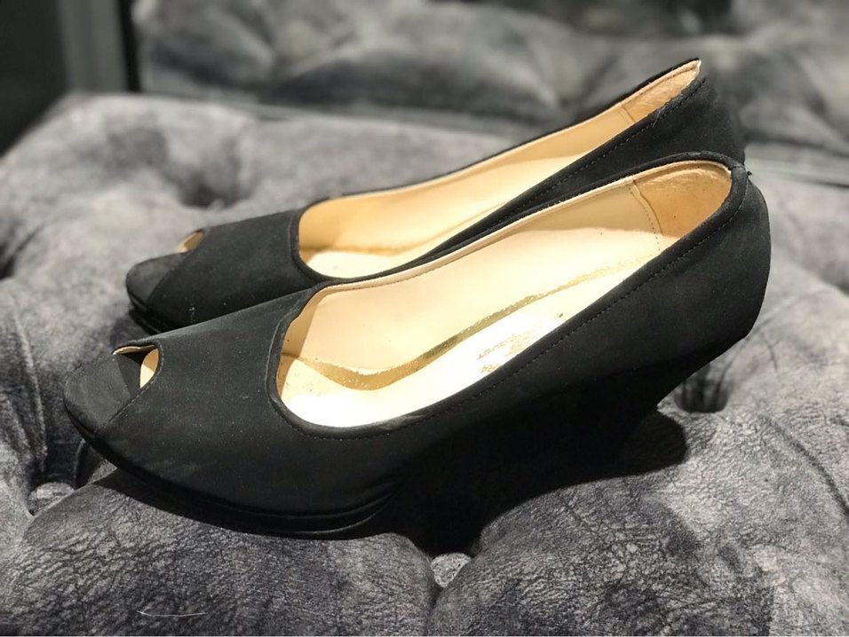 Siyah, süet malzemeden yapılmış topuklu klasik kadın ayakkabısı. Düz ve desen içermeyen tasarımıyla ofis kullanımı için uygundur. Topuk 4-5 cm dir. 2-3 kere kullanılmıştır