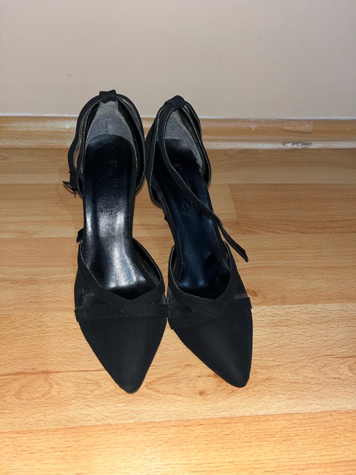 Ofis kullanımı için uygun, tokalı siyah süet stilettolar. Minimalist gotik tarzda, klasik ve zarif tasarım.