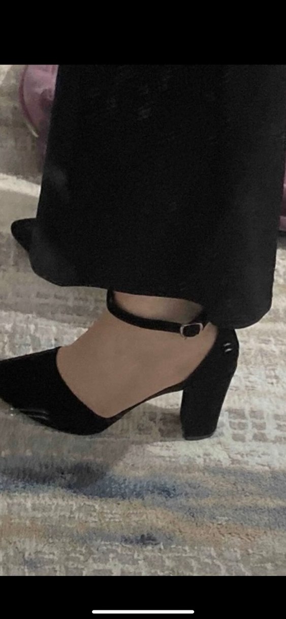 Siyah süet malzemeden, yılan derisi desenli, tokalı bilek kayışlı, blok topuklu kadın ayakkabısı. Klasik ve gotik Paris tarzını yansıtır. Kesinlikle hiç giyilmedi düğün için aldım. Giymedim