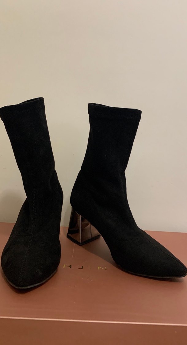 Siyah süet kadın botları, blok topuklu ve desensiz tasarımıyla romantik akşamlar için uygun. Gotik tarz ve Parisli şıklığını bir arada sunar.