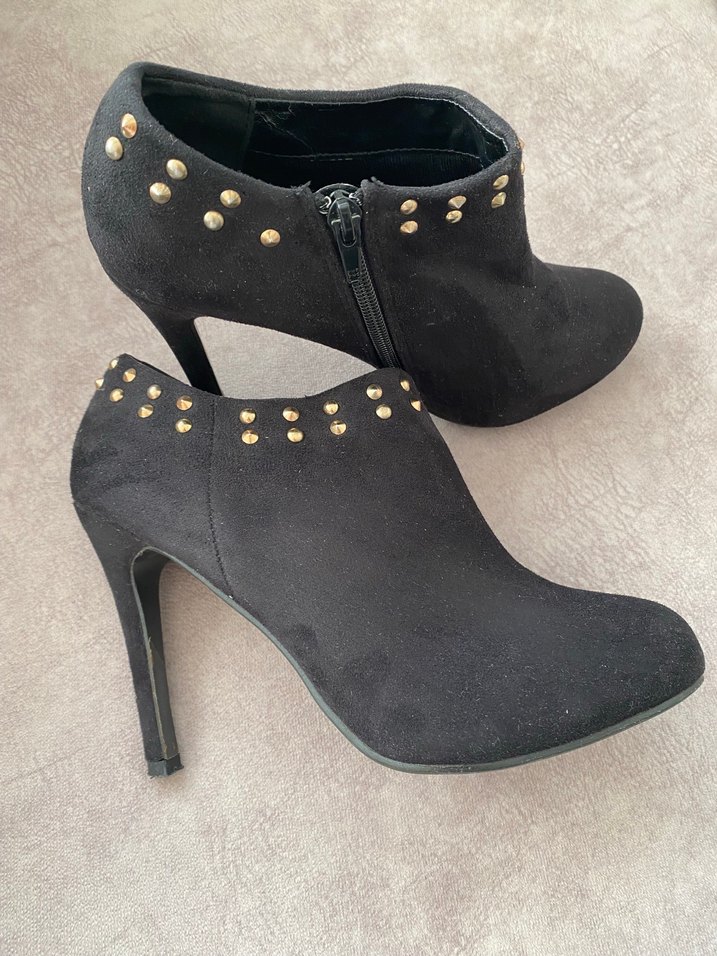 Siyah süet kadın botları, ince topuklu ve altın renkli perçin detaylı, yan fermuarlı. Cesur ve göz alıcı bir tarz için uygun.