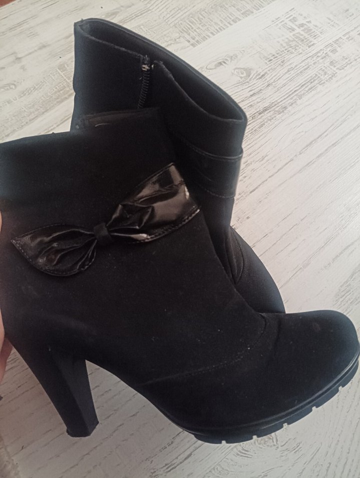 Siyah süet malzemeden yapılmış, kurdele detaylı ve incelen topuklu kadın botu, günlük kullanıma uygun gotik tarzda şık bir model.Nerdeyse hiç kullanılmadı. Numarası olmuyor. Silinip gönderilecek.