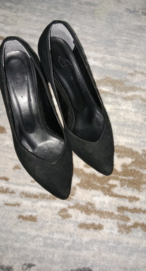 Siyah süet kadının stiletto topuklu ayakkabısı, sivri burunlu ve kürk detaylı, klasik ve minimal goth tarzında, ofis kullanımı için uygun.