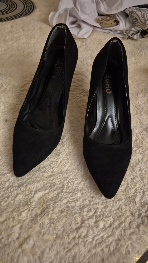 Siyah süet stiletto topuklu ayakkabılar, kürk detaylı ve ince sivri burunlu. Ofis için klasik ve minimalist goth tarzda tasarlanmıştır.