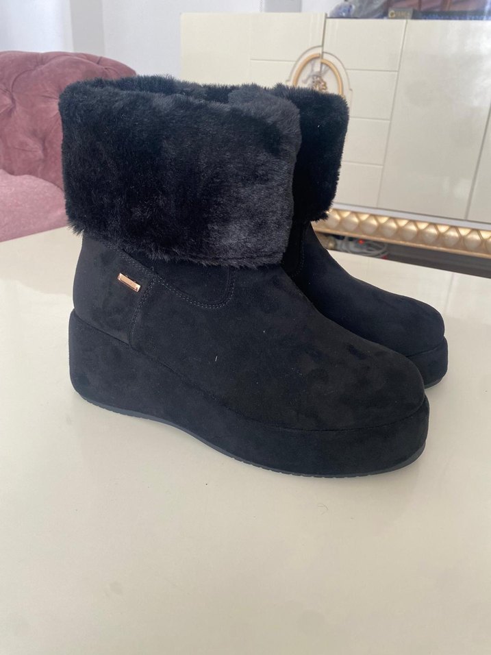 Siyah süet malzemeden, dolgu topuklu ve tüylü detaylara sahip rahat, günlük kullanıma uygun gotik tarzda botlar.