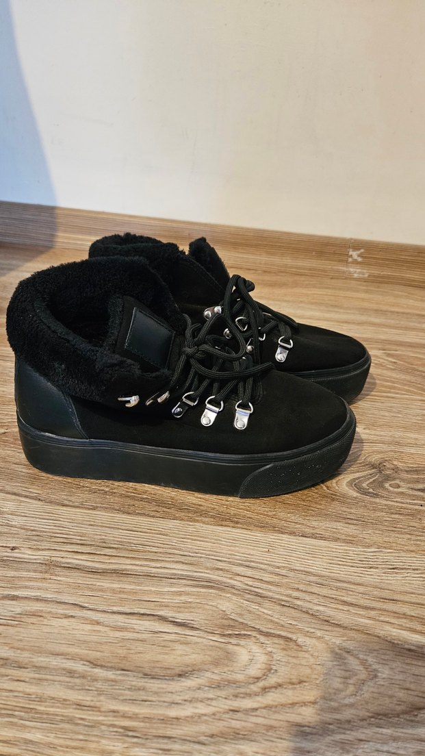 Siyah süet malzemeden, tüylü detaylara ve kalın topuğa sahip, bağcıklı, rahat ve şık günlük bot. Ürünün bir tokası düşmüştür, ip uçları da kullanımdan dolayı yıpranmıştır fakat kullanım açısından sorun çıkarmamaktadır. Tam kalıptır.