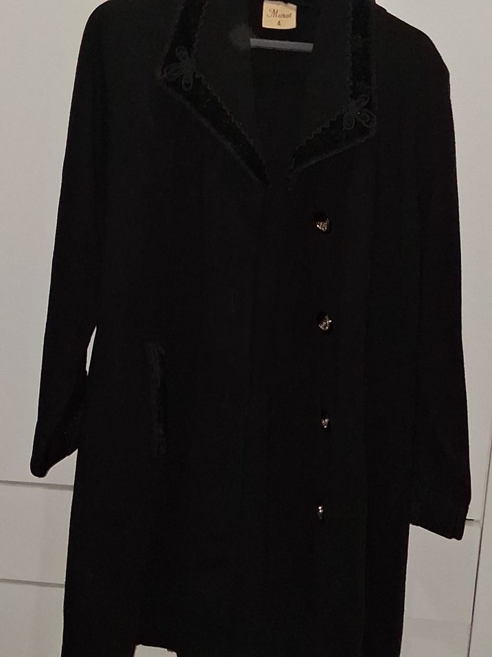Siyah süet kaban, kesik yaka ve düğmeli ön detaylarına sahiptir. Uzun kollu, uzun boylu ve klasik tarzında.