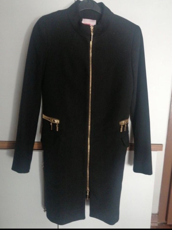 Siyah süet uzun kadın kaban, çıtçıtlı yakalı ve fermuarlı ceplidir. Ofis için uygun, klasik ve sokak stili arasında bir tasarıma sahiptir.