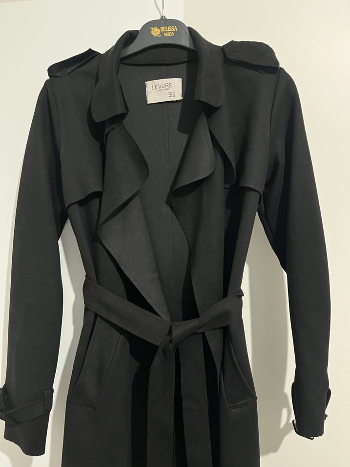 Siyah süet kumaştan yapılmış, kemerli, uzun kollu ve uzun boylu kadın trençkot. Notched lapel yaka ve regular fit kesimle ofiste şık bir Paris tarzı sunar. LEWURE markalı.