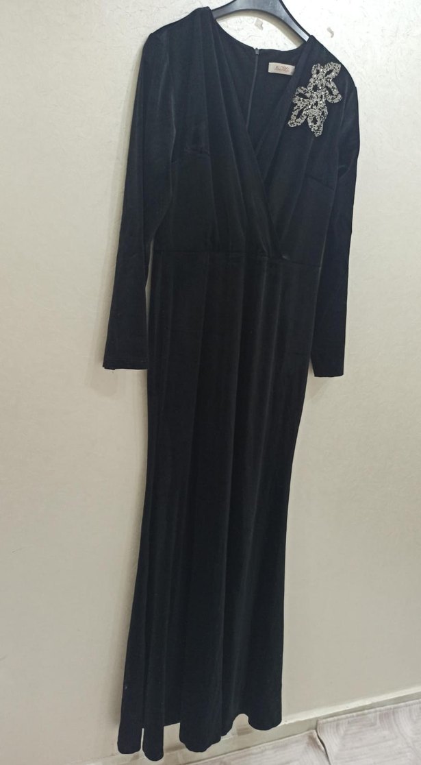 Siyah süet kumaştan, drapeli ve V yaka uzun kollu, klasik şıklıkta gotik tarzda, ofis için uygun dar kesim uzun elbise.