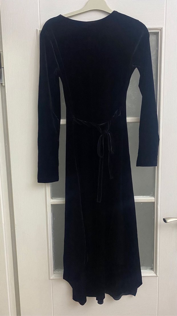 Siyah süet kumaştan, uzun kollu ve yüksek yakalı, kemerli, vücuda oturan uzun elbise. Gotik tarzı ve ofis kullanımı için uygundur.