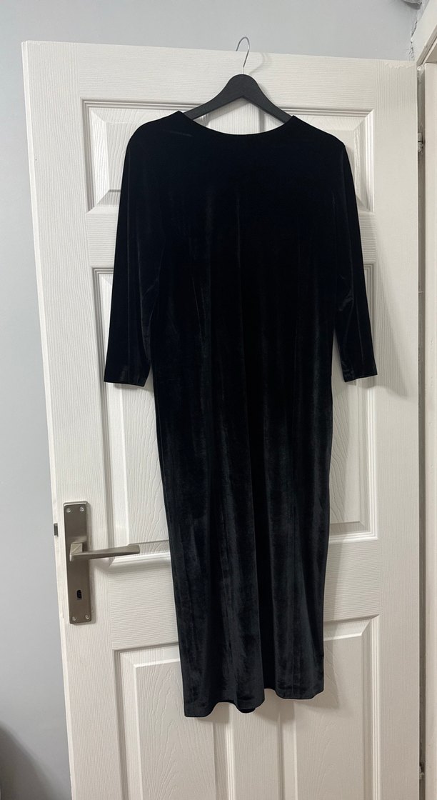 Siyah süet kumaştan, uzun kollu ve V yakalı, drapeli, fitted kesim uzun elbisedir. Gotik tarzda olup ofis kullanımı için uygundur.