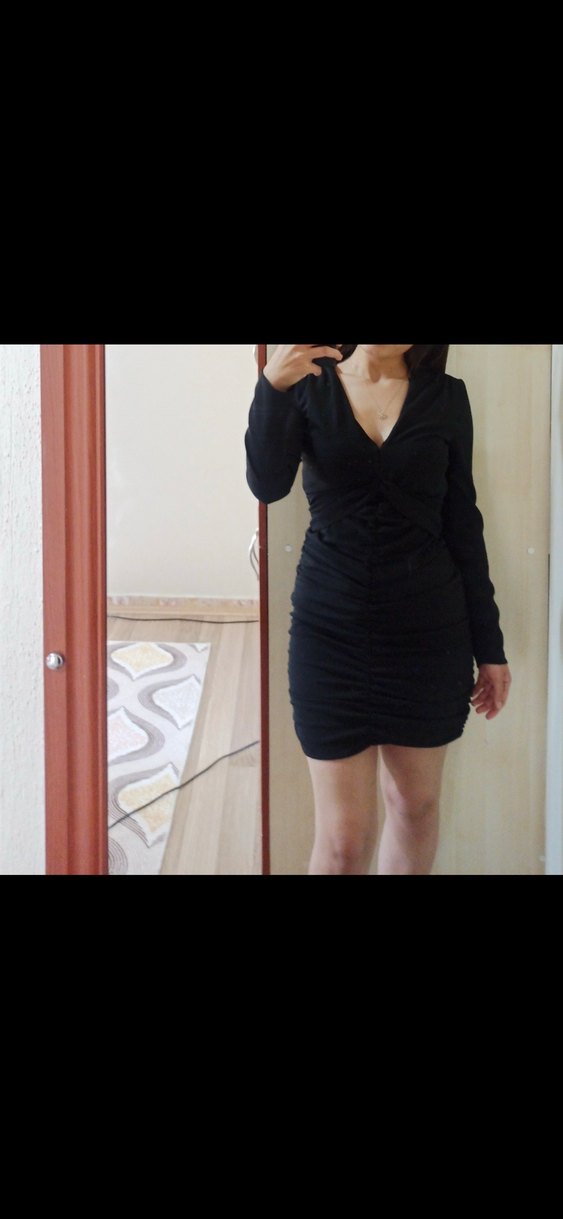 V yaka ve uzun kollu, drapeli siyah süet mini elbise. Fitted kesimi ve minimalist gotik tarzıyla romantik akşamlar için uygun.