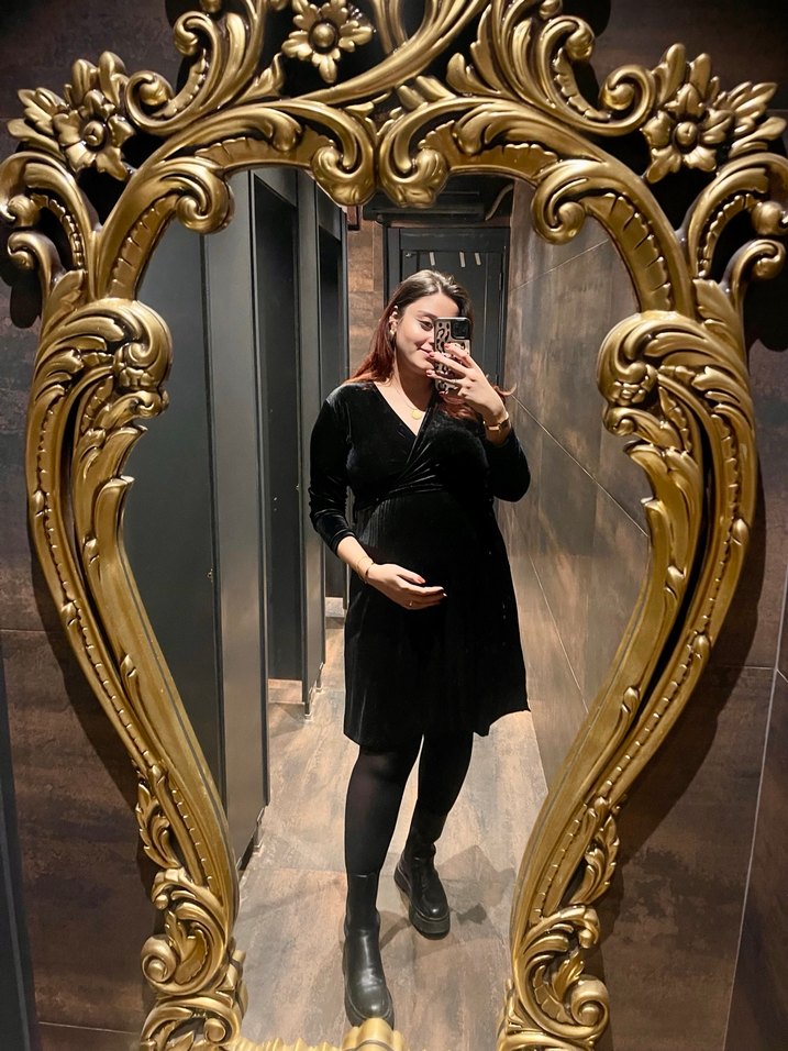 V-yaka ve uzun kollu, siyah süet kumaştan yapılmış, midi boy ve gotik tarzda, vücuda oturan hamile elbisesi. Romantik akşamlar için şık ve cesur bir tercih.
