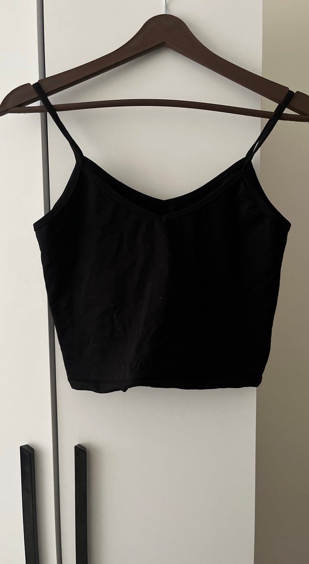 Siyah süet kumaştan, V yaka ve ince askılı, minimalist gotik stilde, günlük kullanıma uygun, vücuda oturan crop top.
