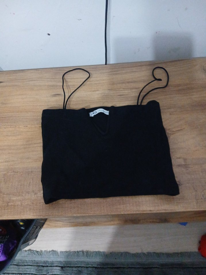 Siyah süet kumaştan, V yaka ve ince askılı, kısa kesim şık ve minimal kadın atlet.