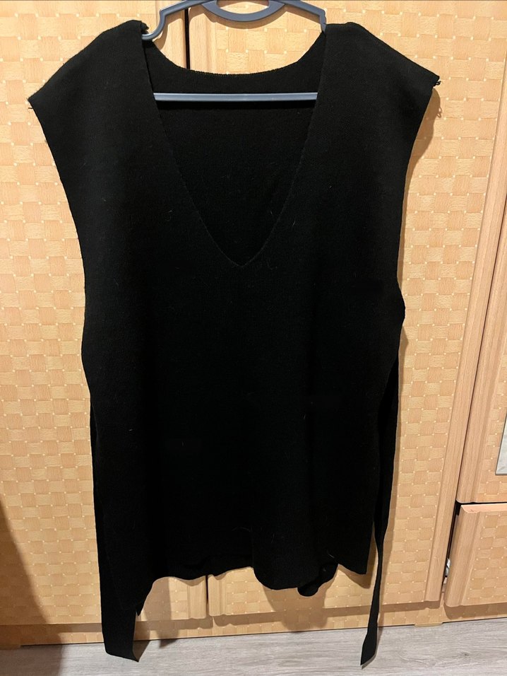 Siyah süet, kolsuz, V yakalı ve bol kesim midi uzunlukta kadın süveter, minimal ve gotik tarzda, günlük kullanım için rahat bir şıklık sunar.