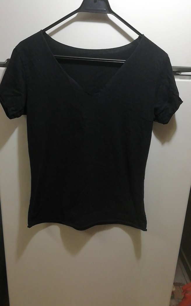 Bu siyah süet tişört, V yaka ve kısa kollu olup, minimalist gotik tarzda cesur ve zahmetsiz şıklık sunar. Günlük kullanım için uygundur.